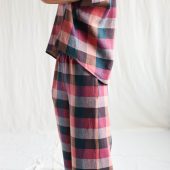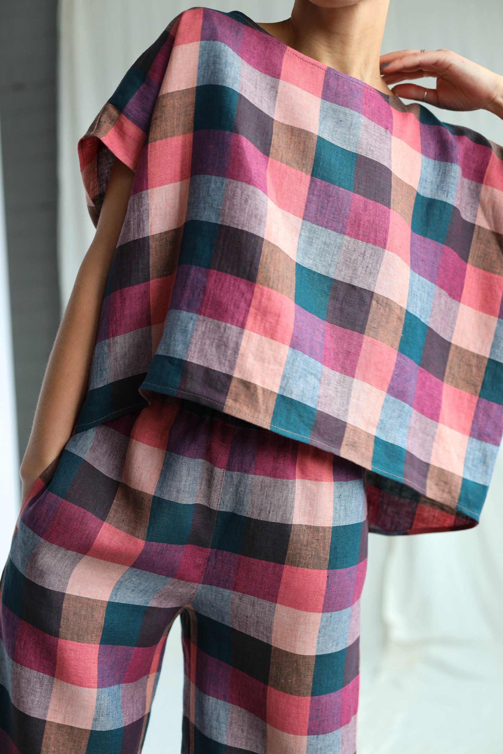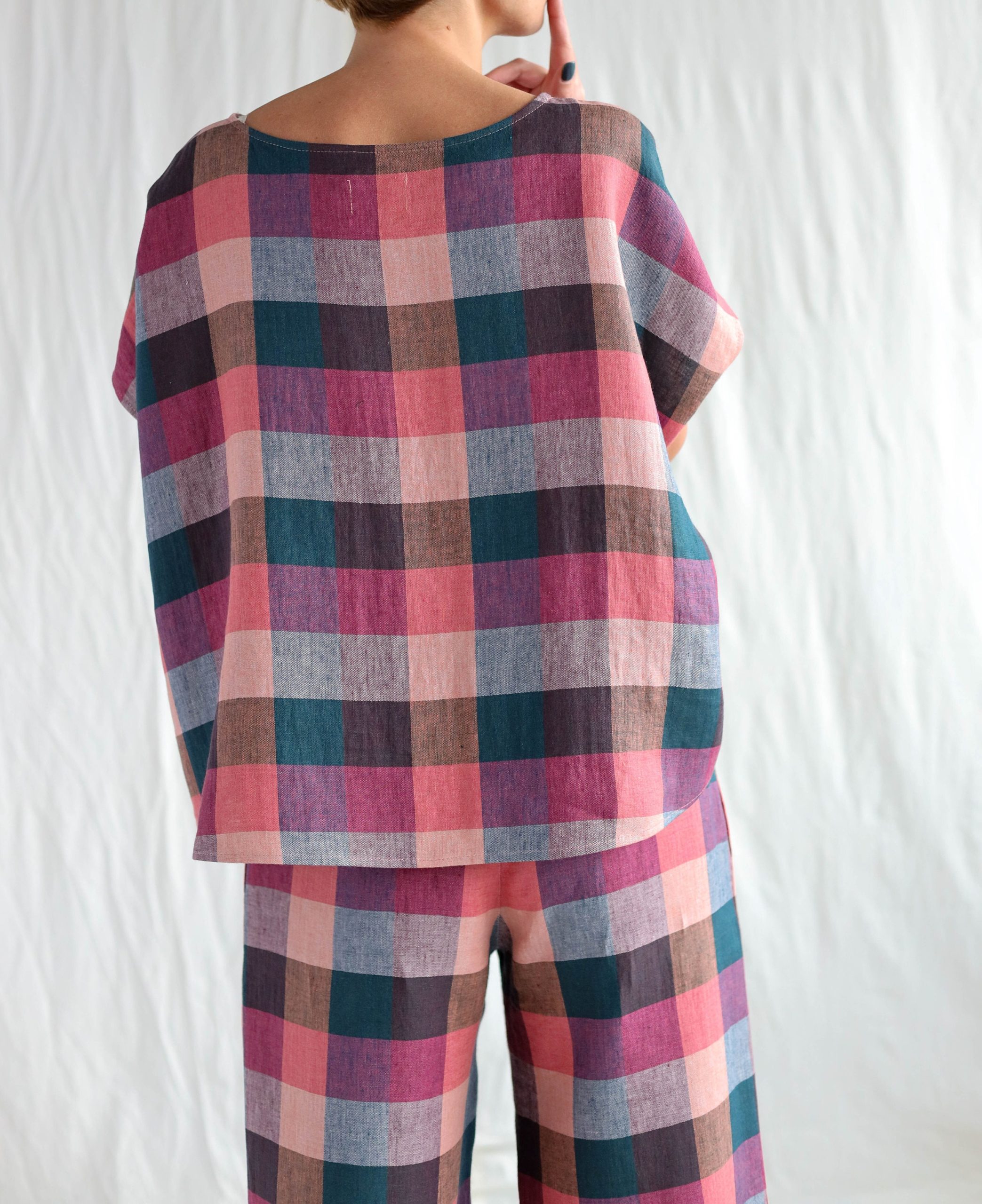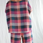 Simona is wearing a multicolored checks linen top in size S/M and is 172 cm/5’8″ tall.